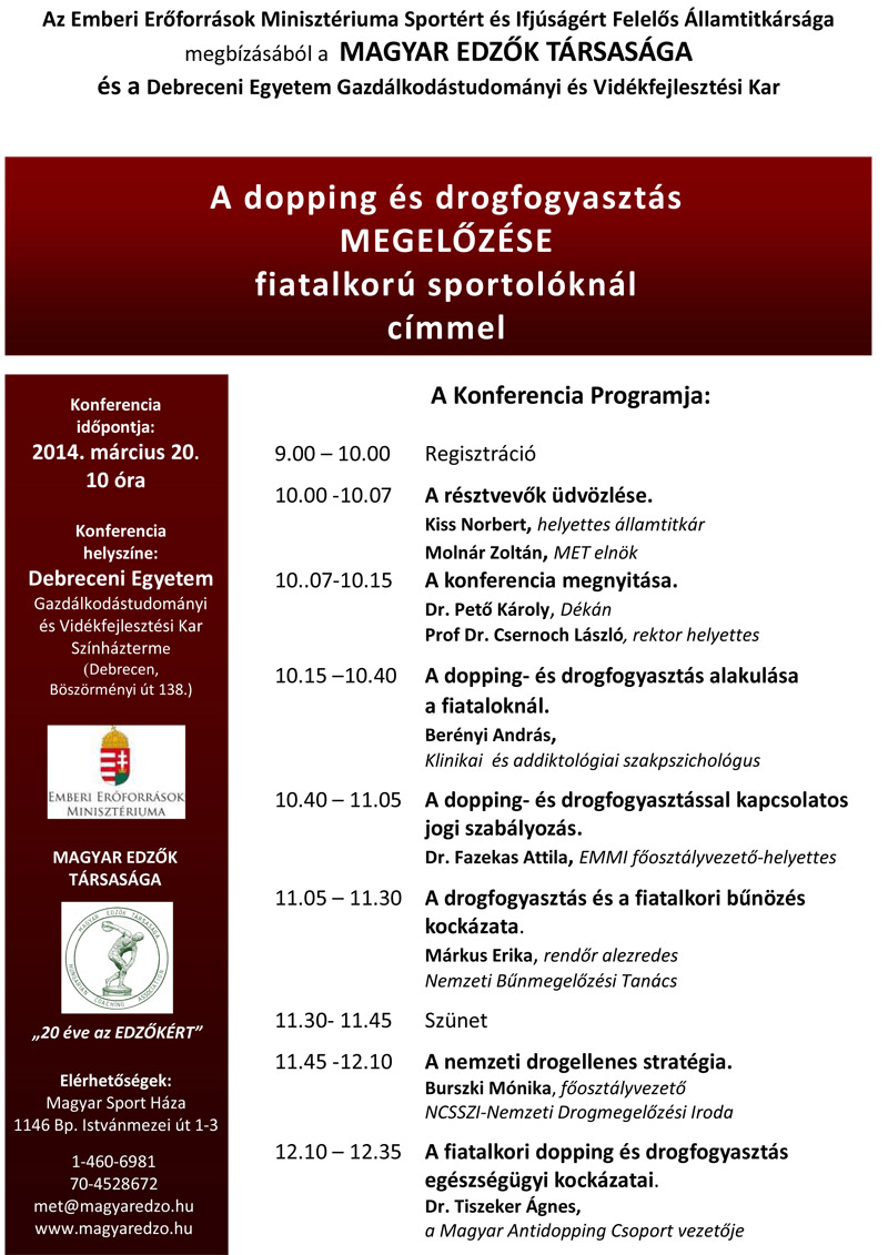 A dopping és drogfogyasztás MEGELŐZÉSE fiatalkorú sportolóknál címmel rendez konferenciát a Magyar Edzők Társasága és a Debreceni Egyetem Gazdálkodástudományi és Vidékfejlesztési Kara 2014. március 20-án!