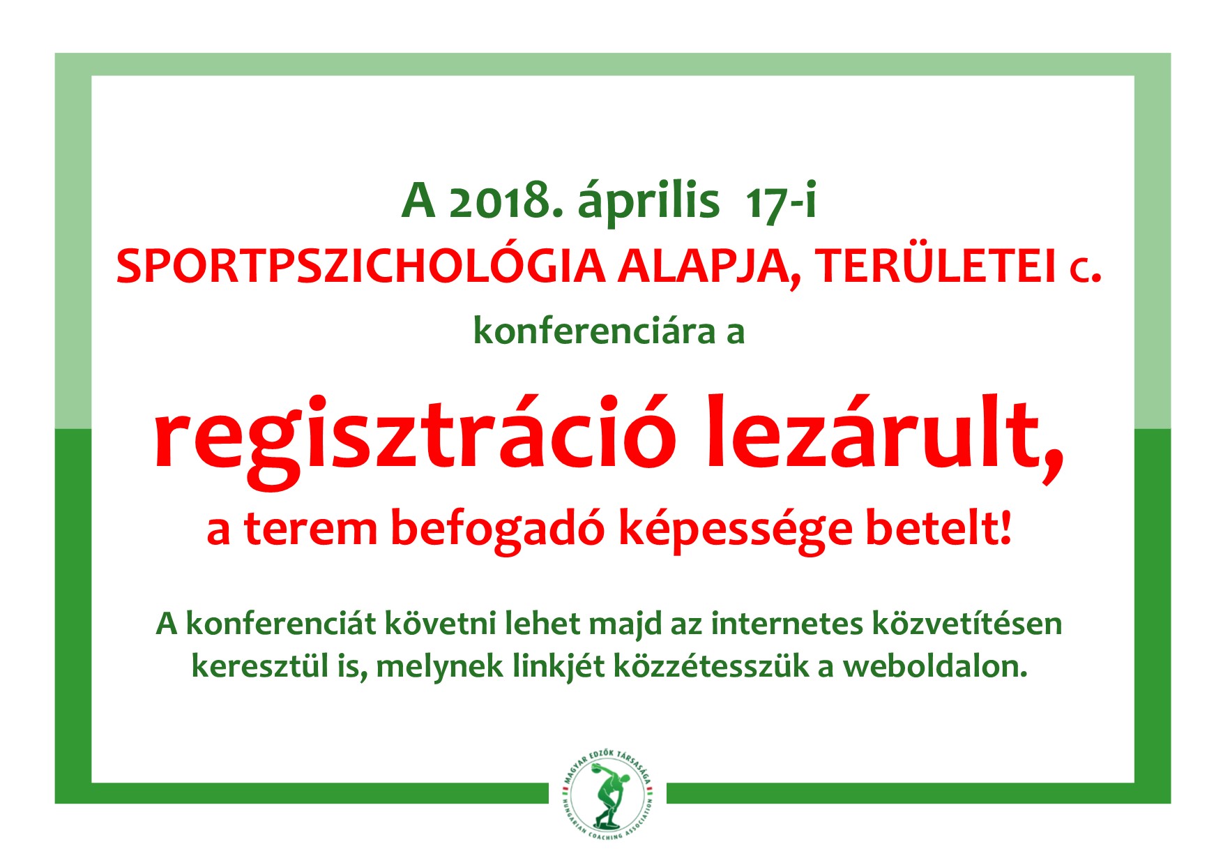 A sportpszichológia alapjai, területei konferenciára a jelentkezés betelt! Dikácz Ernő által|2018-04-17T23:05:37+02:00március 3rd, 2018|Hírek|0 hozzászólás