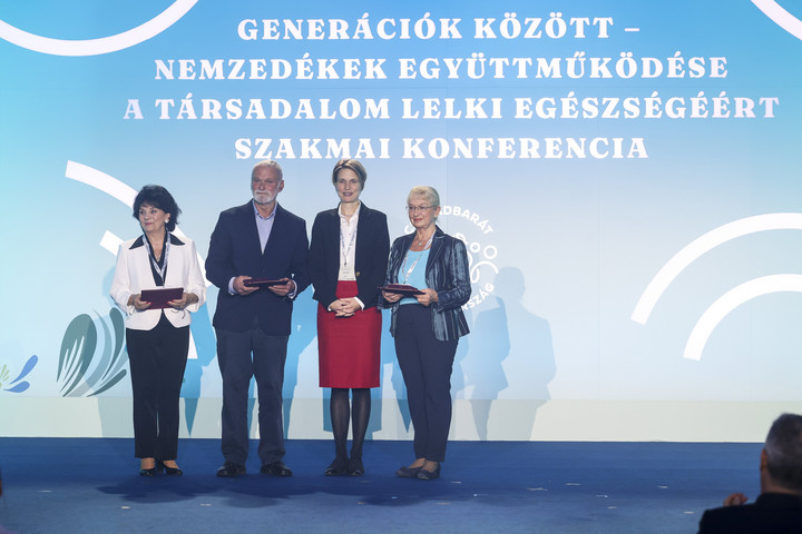 Nagy Józsefné igazgatásszervezõ (b), Soós Ferenc kollégiumi nevelõtanár, testnevelõ, maratoni versenyek résztvevõje és Amberger Erzsébet járványtani szakorvos, Sopron nyugalmazott tisztifõorvosa (j), miután átvették a Monspart Sarolta-díj az idõsekért elismerést Hornung Ágnestõl, a Kulturális és Innovációs Minisztérium családokért felelõs államtitkárától a Generációk között – Nemzedékek együttmûködése a társadalom lelki egészségéért címû konferencián a Bálna Budapestben 2023. november 17-én.