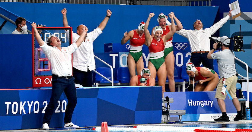 A bronzérmes magyar csapat ünnepli győzelmét a világméretű koronavírus-járvány miatt 2021-re halasztott 2020-as tokiói nyári olimpia női vízilabdatornáján a harmadik helyért játszott Magyarország – Orosz Olimpiai Csapat mérkőzés végén a Tacumi Vízilabdaközpontban 2021. augusztus 7-én. A magyar női vízilabda-válogatott 11-9-re győzött és megszerezte a harmadik helyet.