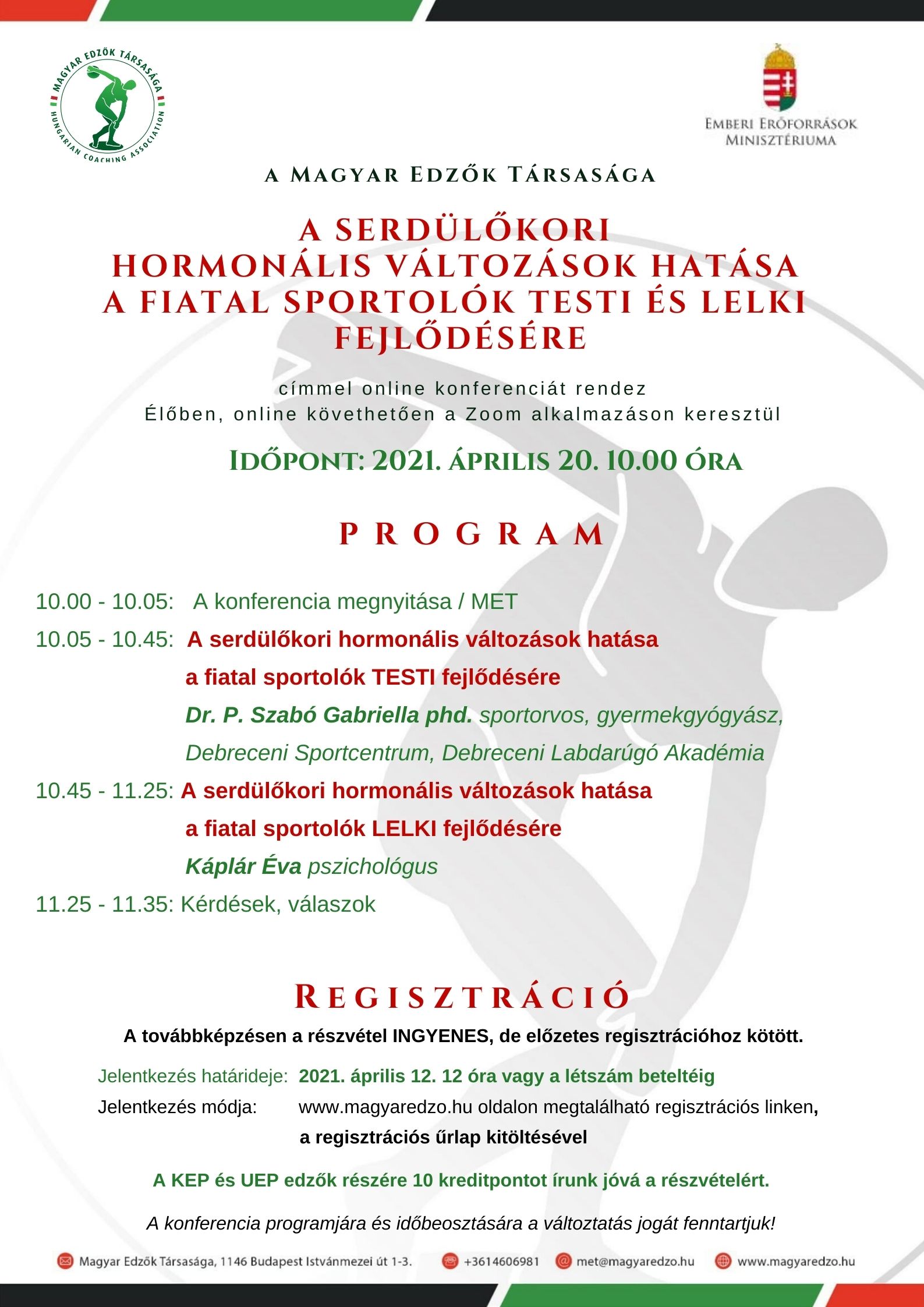 A serdülőkori hormonális változások hatása a fiatal sportolók testi és lelki fejlődésére online konferencia 2021. április 20.
